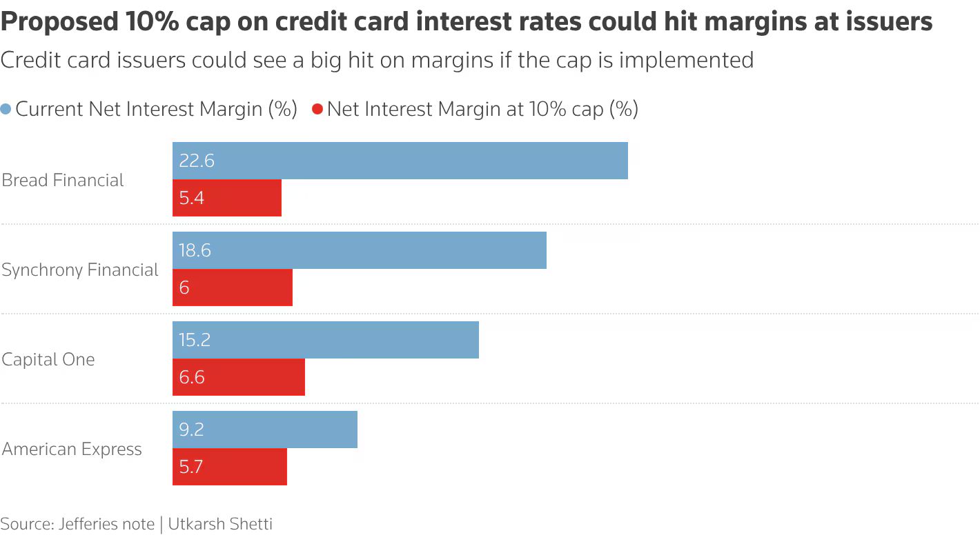 📉 A 10% cap, even for only a year, would cut credit card margins of major banks in half, with some smaller firms potentially losing over 70% of their profit.