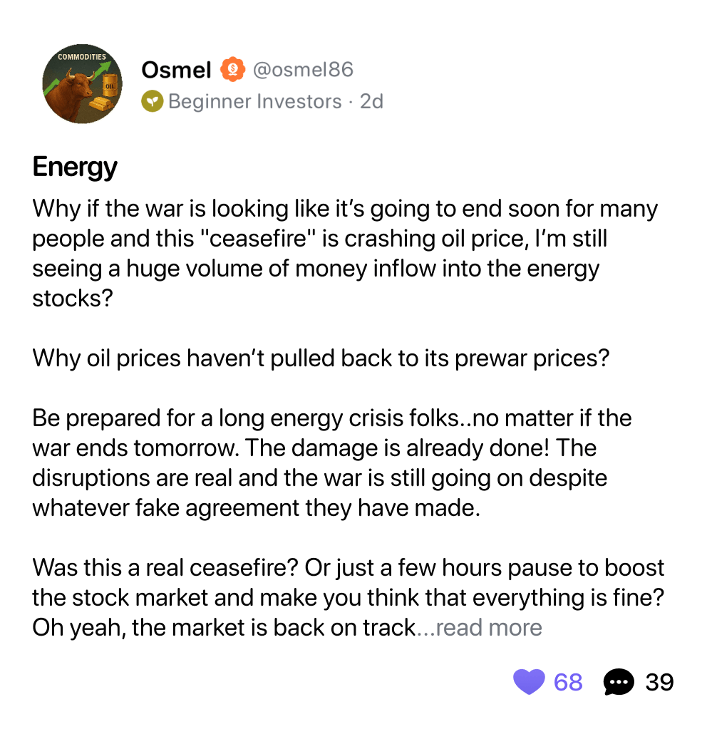 Goldman noted this week that the IT sector's P/E is now below consumer discretionary, staples, AND industrials globally, which almost never happens. They said this isn't a 2000-style bubble situation, and that valuations have room to re-rate higher if the ceasefire holds. Basically: the war created a rare entry point in tech according to Goldman.