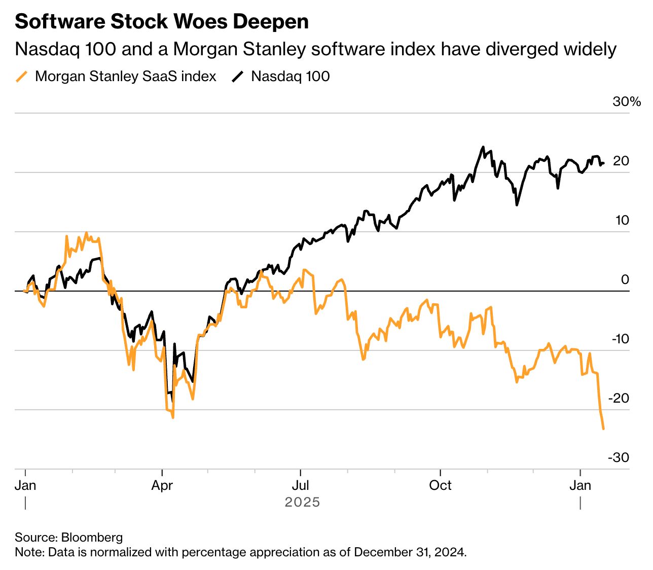🤖 The reason for this downturn? A fear that AI is going to decimate the legacy software business model as AI agents become more able to automate tasks, and as companies need to employ fewer people.