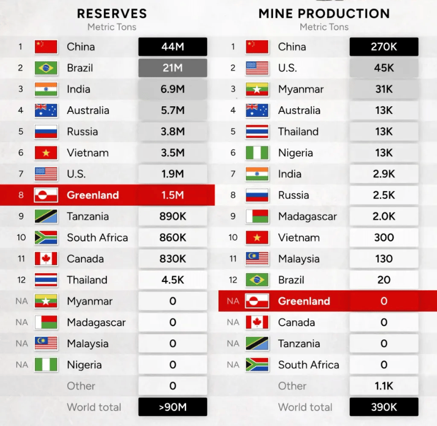 💎 Some of this security is its geographical location, but Greenland’s rich minerals also play a big role. Greenland holds the eighth-largest reserve of rare earths (minerals crucial to the development of electronics, green energy components, and military equipment), and an estimated 10-30 billion barrels of oil.