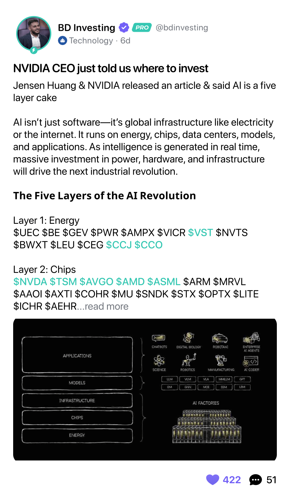š If this sounds familiar, it's because it's the same playbook Google ran with Android. You give away the layer that drives adoption, and monetize the infrastructure beneath it. If Huang pulls this off, Nvidia stops being a chipmaker that sells into commodity cycles and becomes a platform company that compounds.